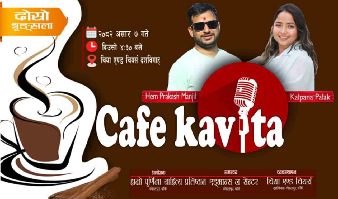 हामो पूर्णिमा साहित्य प्रतिष्ठानको आयोजनामा ‘क्याफे कविता’ कार्यक्रमको दोस्रो श्रृङ्खला आगामी २०८२ असार ७ गते ‘शनिबार’ हुने भएको छ ।